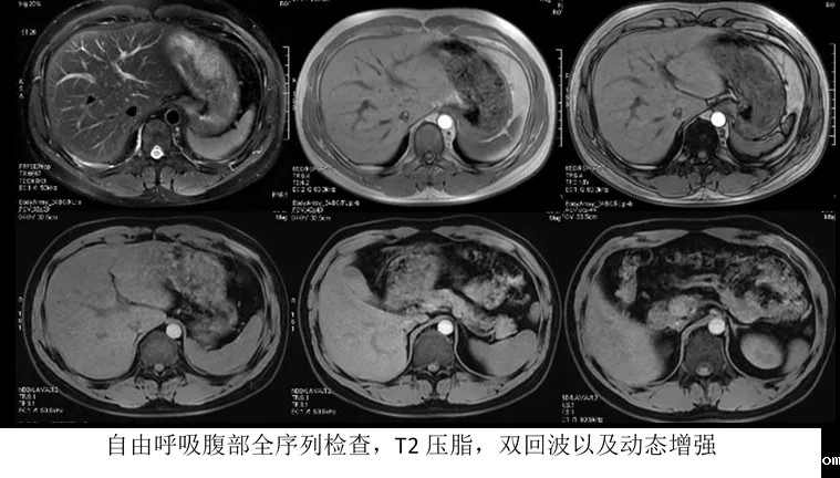 在SIGNA Creator智简平台上,我们可以通过自由呼吸的方式进行腹部全序列的检查,如图中所示,病人在自由呼吸状态下首先完成了常规T2压脂以及双回波的形态检查。随后在保持同样的状态,完成了全肝的动态增强检查。对于对于腹部动态增强检查而言,时间窗极短,在1分钟的时间内以自由呼吸的方式完成3期全肝的扫描需要极快速度采集速度以及高度的伪影抑制能力。